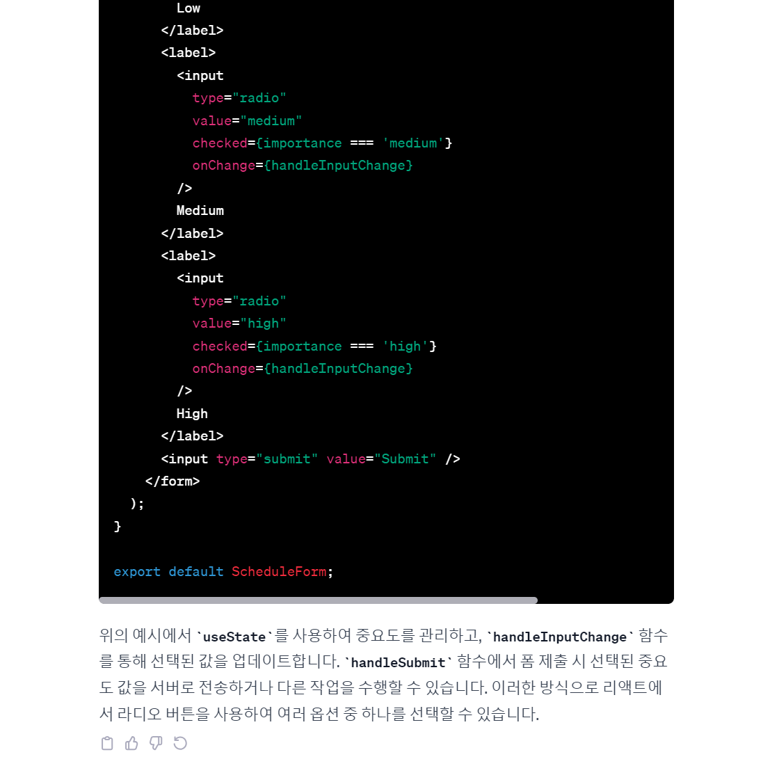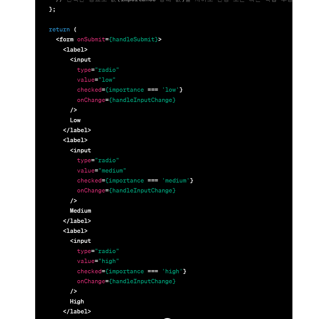 3)폼 데이터로 전송될 값 설정: 사용자가 선택한 값을 폼 데이터로 전송할 때 해당 값으로 사용됩니다.