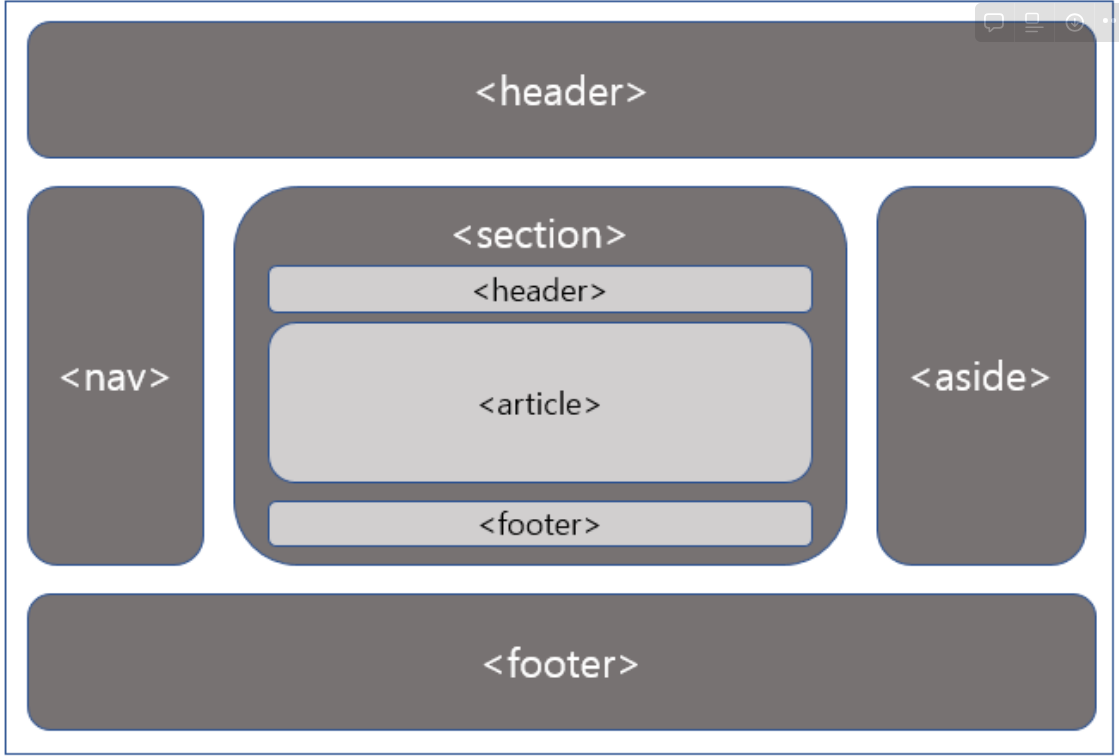 - aside : 페이지의 주요 내용 외의 내용 정의 (페이지의 주요 내용 주변에 위치하여 관련내용 배치 - 예) 광고)
