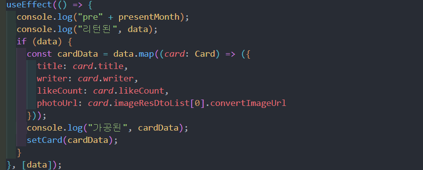 페이지코드의 useEffect의 의존성 배열엔 data만을 넣어서, useOtherCollection에서 받아온 data의 값이 달라질 때마다 cardData를 새로 map해서 렌더링되도록 했다