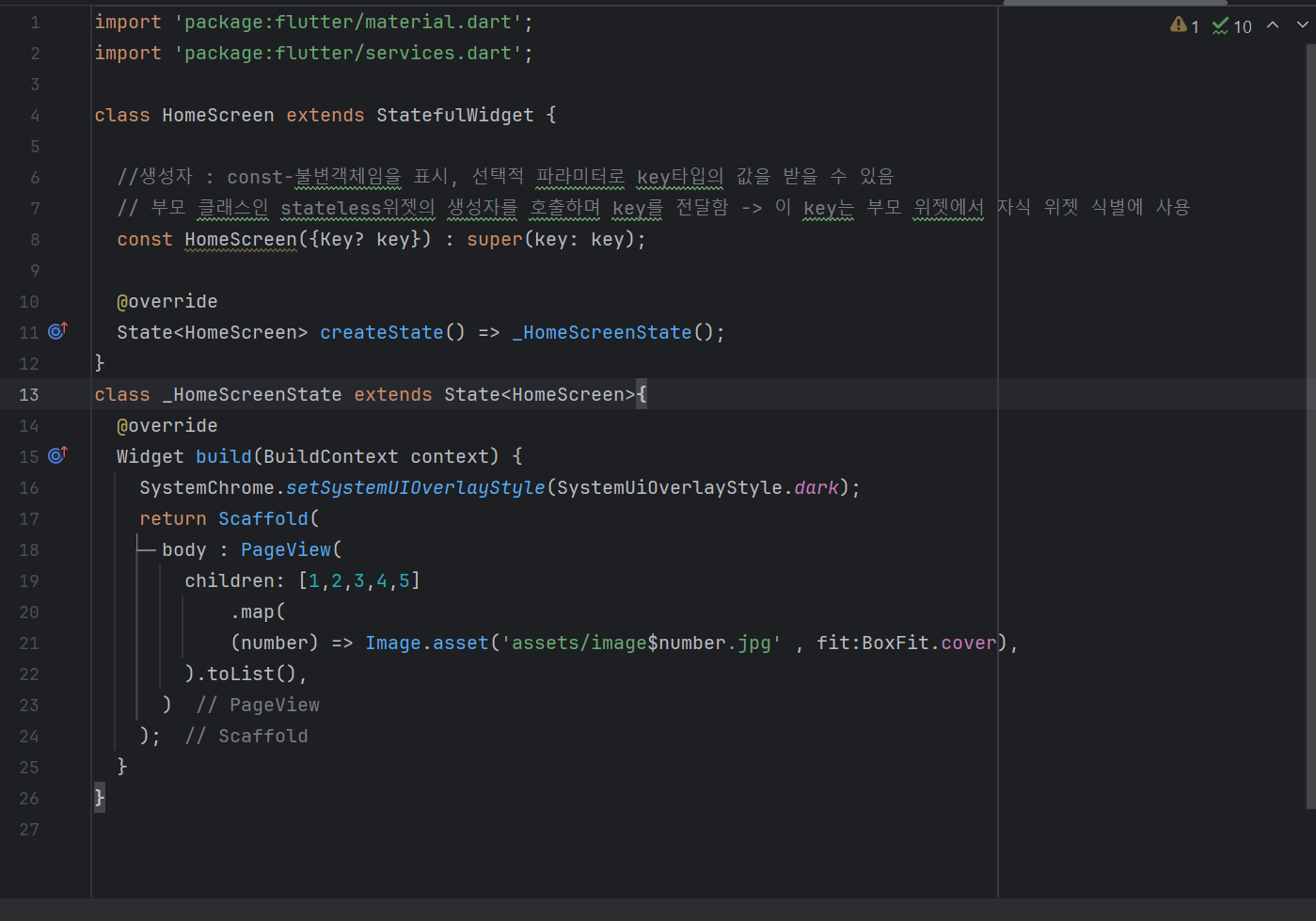 - 우선 홈스크린은 스테이트풀 위젯을 상속받는 클래스로 하고, createState()를 오버라이드 해주었다 -> _HomeScreenState라는 상태 객체를 생성 (앞의 내용에서, createState()는 필수로 오버라이드 해야하는 함수로, stateful위젯과 연동되는 state를 생성한다고 배움) 다시말해 createState() 메서드는 _HomeScreenState 객체를 생성하여 반환하며, 이 객체가 실제 상태를 관리하고 UI를 업데이트한다