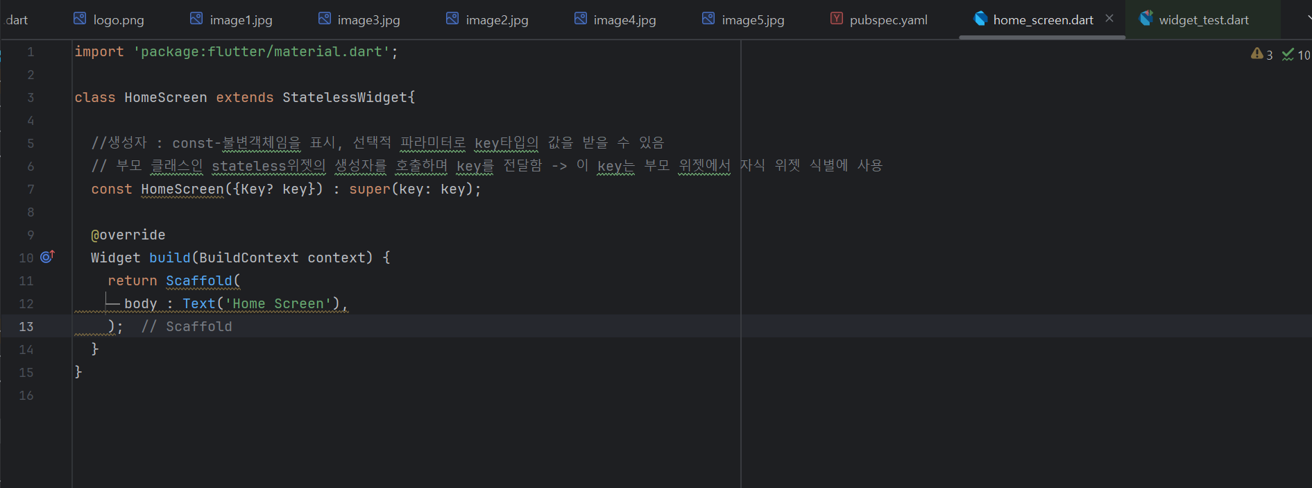- _HomeScreenState 클래스는, 먼저 생성한 stateful위젯 클래스(HomeScreen)를 매개변수로 받는 state클래스를 상속한다 -> 앞에서 배운 것처럼 build 함수는 state에서 정의한다 (앞에서 배운 것처럼, 위젯 클래스와 스테이트 클래스 두개로 이뤄진 모습)