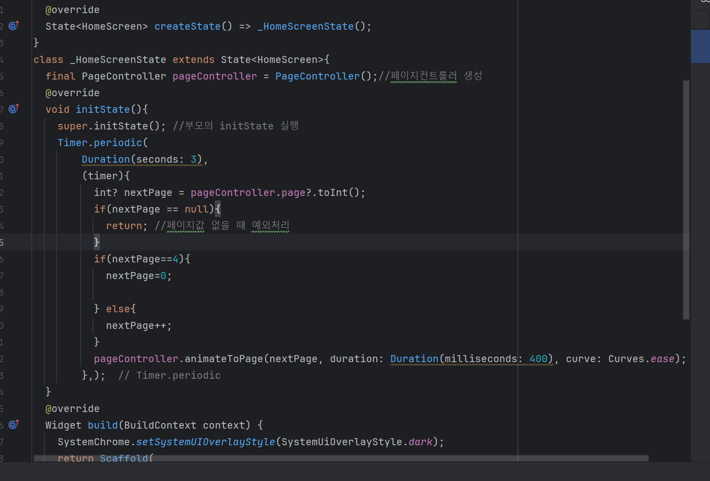 - 이제 컨트롤러를 등록했으니, timer.periodic의 콜백함수를 변경하여 주기적으로 페이지가 자동으로 넘어가도록 구현한다