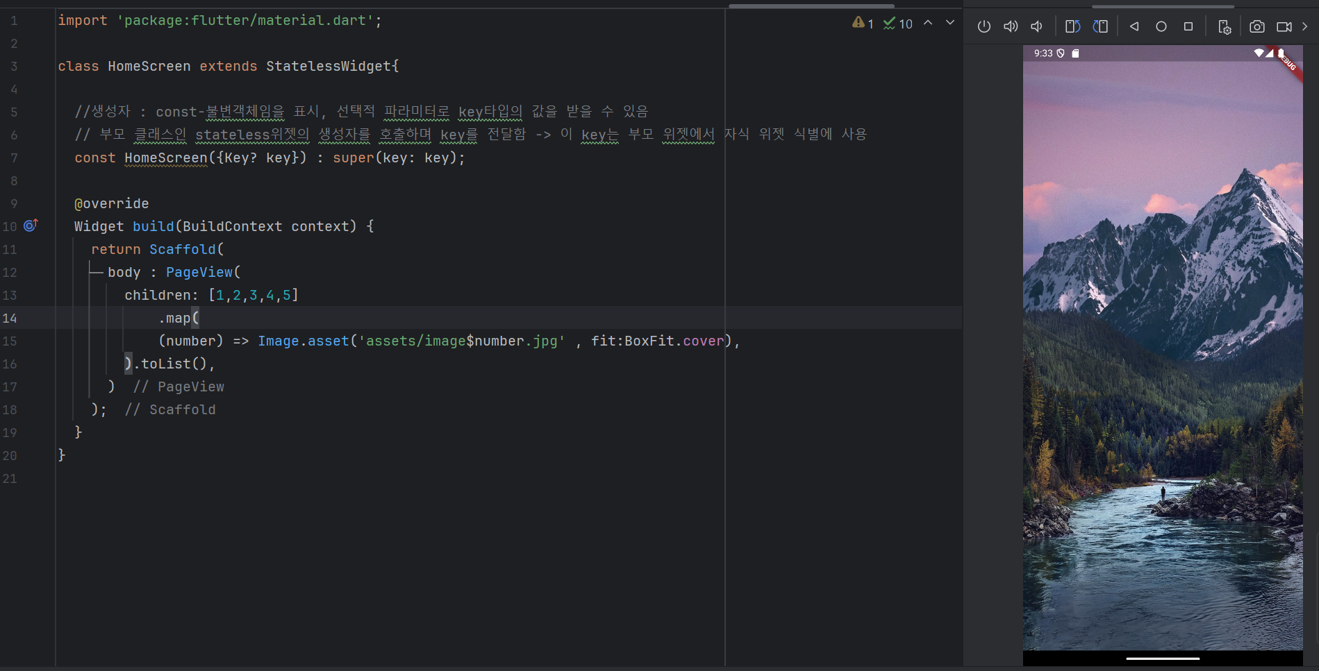 - PageView 위젯 (가로 또는 세로로 스와이프해 화면에 보이는 위젯을 변경하도록 해줌) , Timer (주기적으로 작업 반복 시에 사용), StatefulWidget (지금까지 stateless위젯만 다뤘는데, 이번에 stateful 다뤄볼 것)
