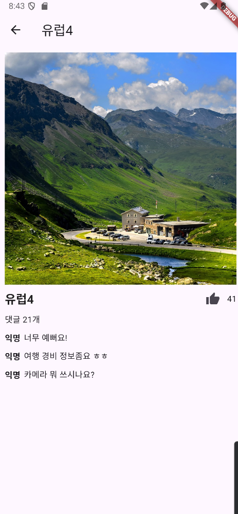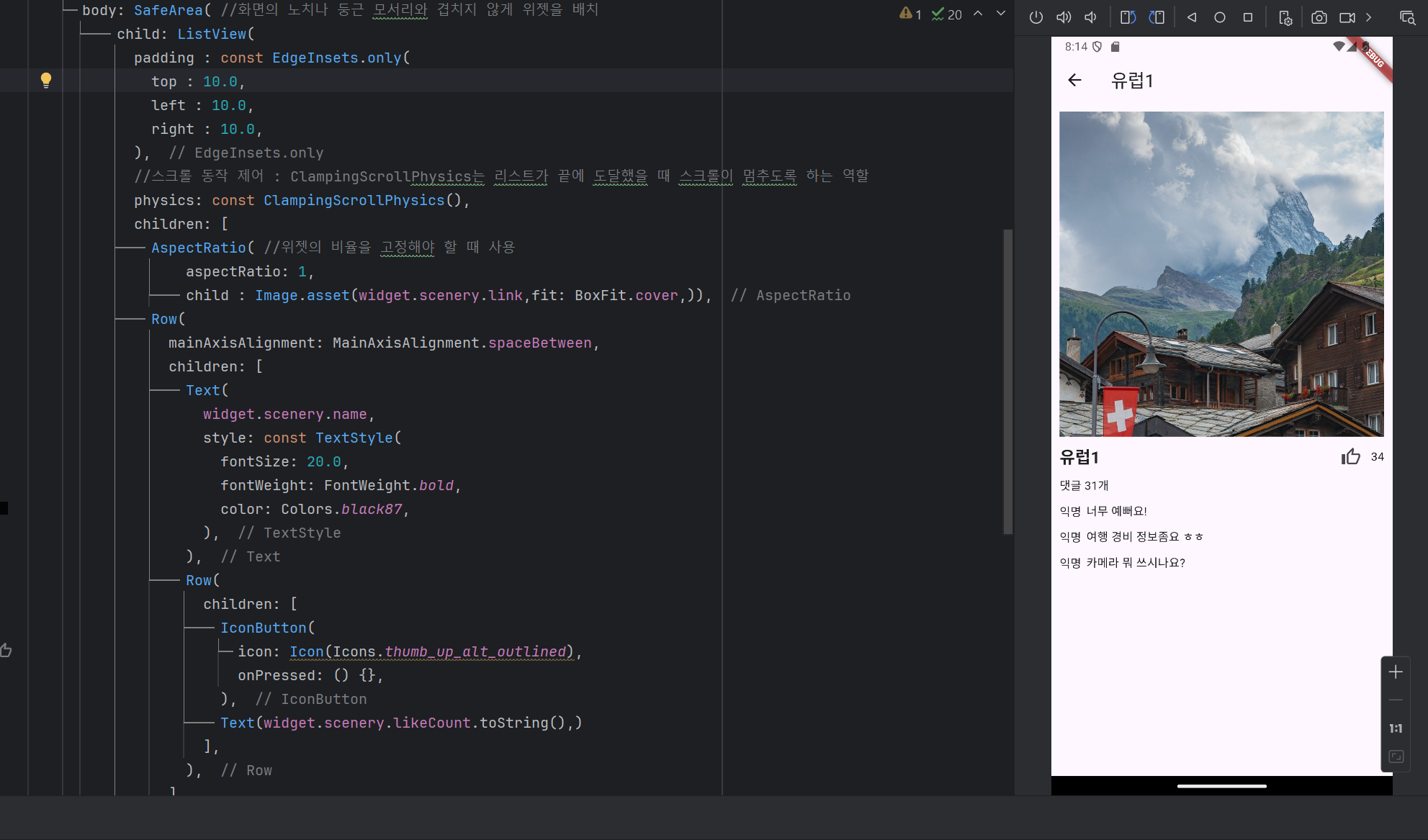 - 그 밑에 row 위젯으로 글 제목과 (아이콘+좋아요수)를 넣어준다