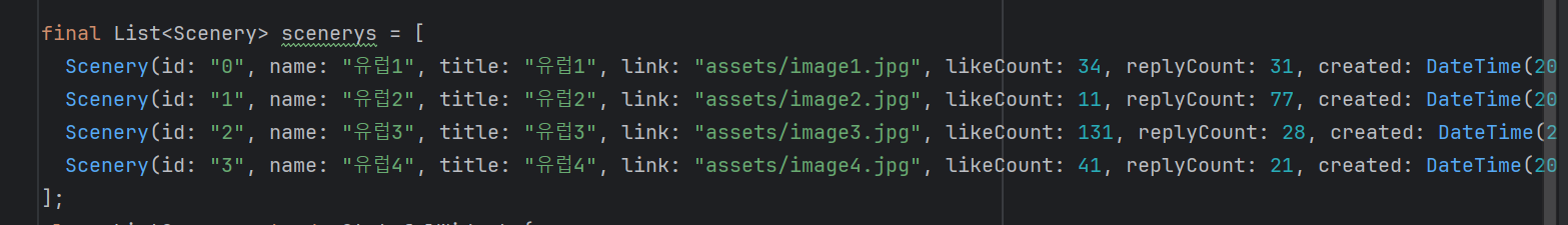 - lib 폴더 안에 model 폴더를 생성하고, 그 안에 scenery.dart 파일 생성