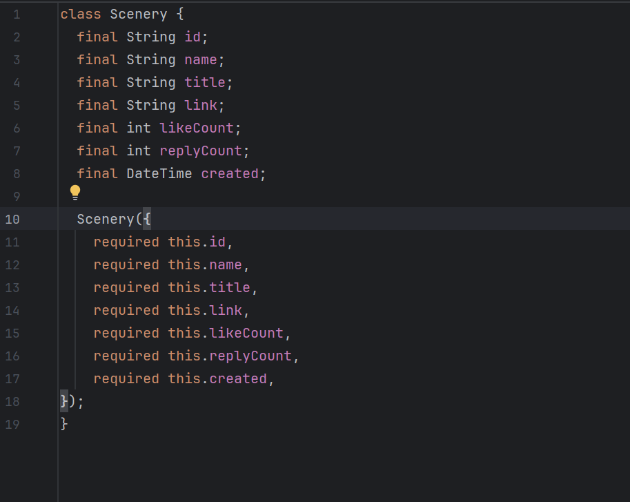 scenery.dart를 위와 같이 작성한다 (필드와 생성자 작성)