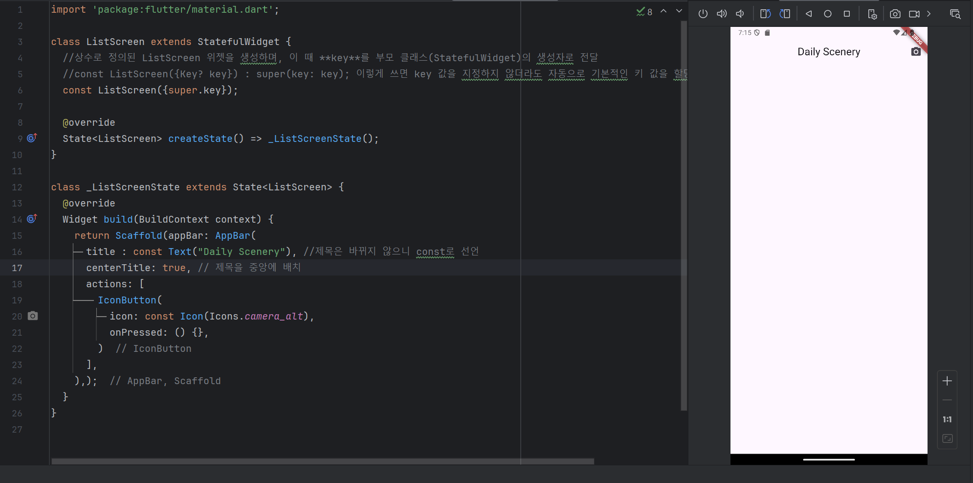 이렇게 해서 앱바를 만들었다 (근데 카메라 아이콘까지 기본제공을 해준다... 진짜신기)