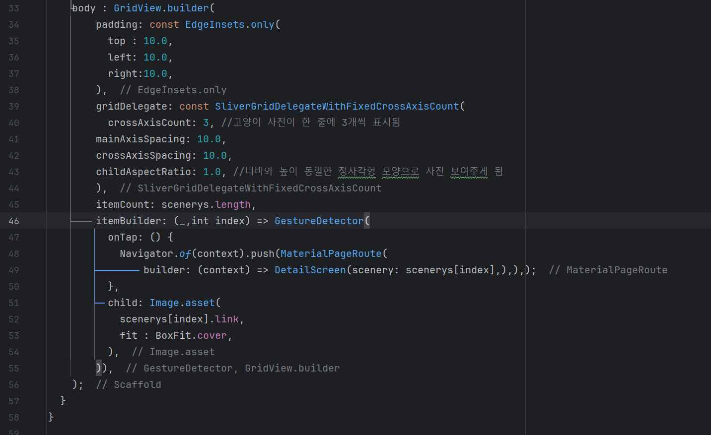- GridView.builder 형태로 사용하면 itemCount번 만큼 itemBuilder가 반복되어 각 항목 생성(인덱스는 0부터 itemCount-1까지)