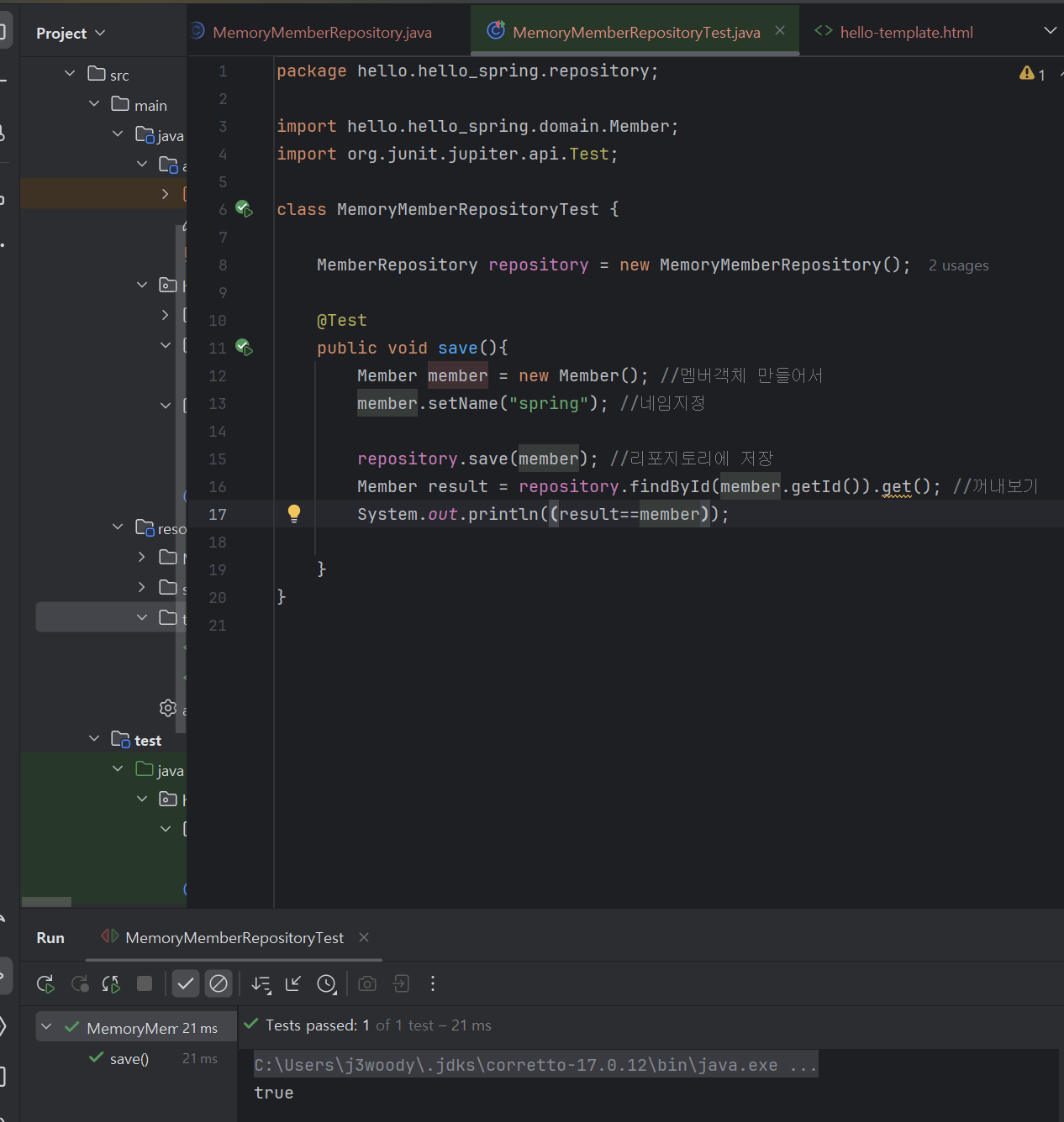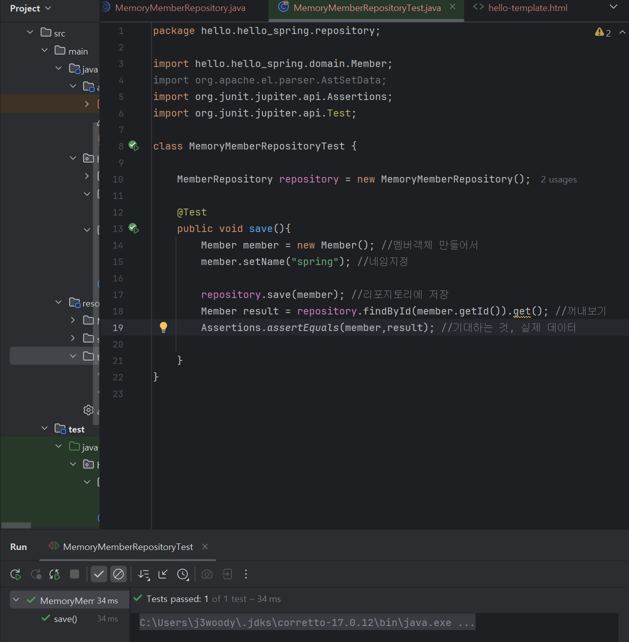생성한 멤버객체와 리포지토리에서 꺼낸 result가 같다고 뜨는 모습