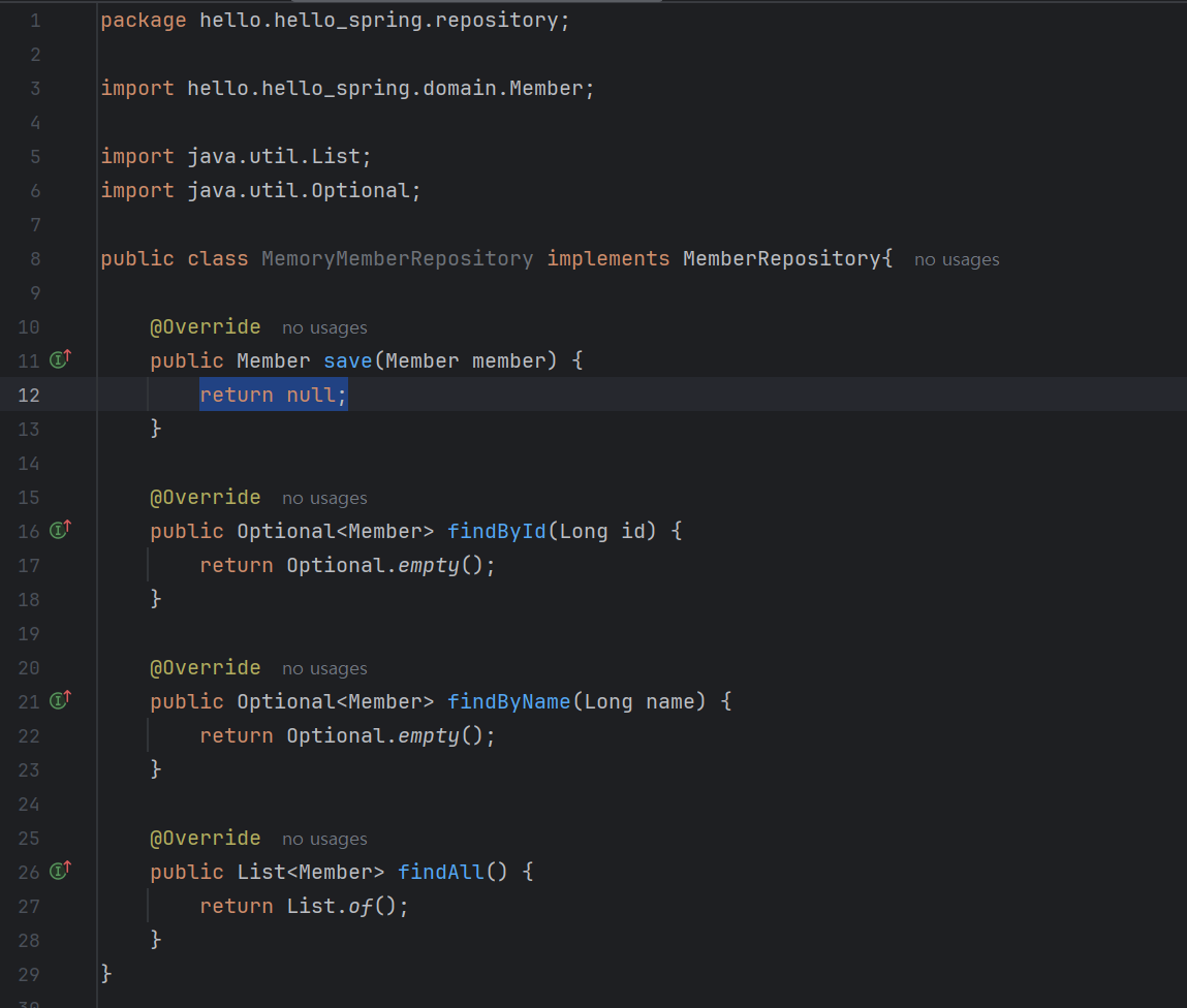 implements MemberRepository까지 쓰고 우클릭해서 implements method누르면 override해야하는 내용들을 위와같이 자동으로 불러와준다