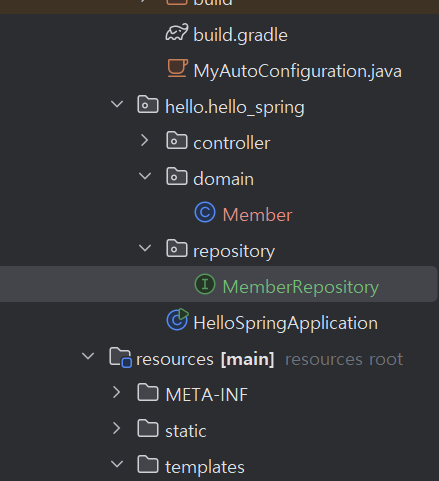 - 회원 비즈니스 로직에 회원서비스가 있고, 회원 리포지토리(회원을 저장하는 것)는 인터페이스로 구현 -> 이유 : 아직 데이터 저장소가 선정되지 않아서, 우선 인터페이스로 구현 클래스를 추후 변경할 수 있도록 설계