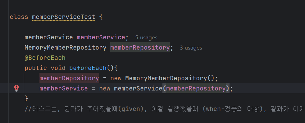 **service클래스에서의 멤버리포지토리와, 테스트클래스에서의 멤버리포지토리가 다른 객체인 상황(각각 new사용)