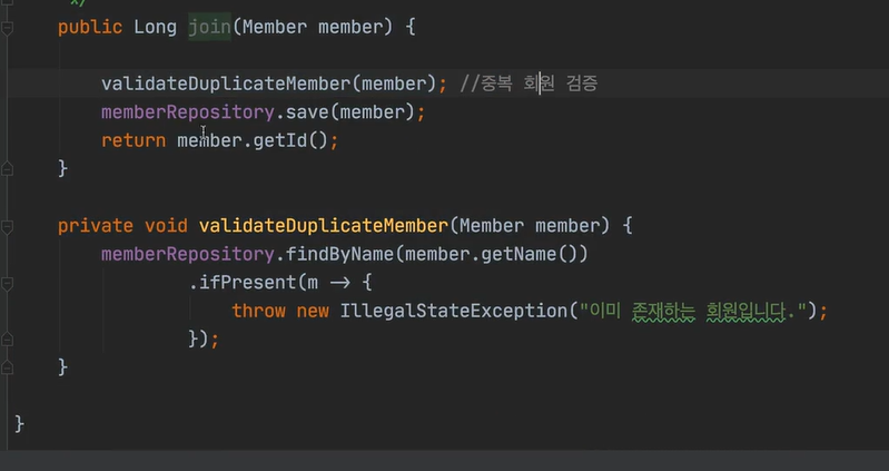 중복 회원 검증 코드를 위와 같이 따로 메소드로 뺄 수도 있다