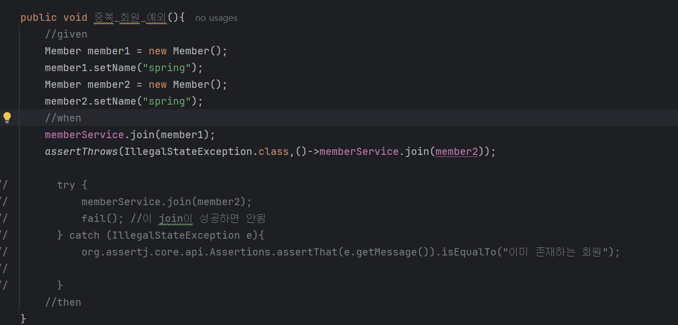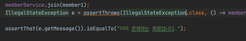 try-catch보다 더 간결한 문법 : assertThrows : join(member2)라는걸 실행했을때 IllegalStateException이라는 예외가 실행되어야한다는 의미