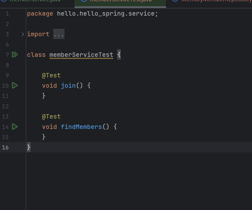이때 멤버서비스 객체를 원활히 찾기 위해 멤버서비스 클래스에 @Service 어노테이션을 붙여준다