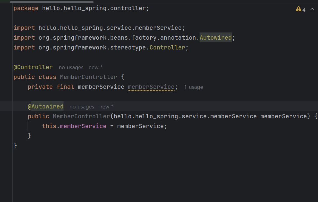 이때 멤버서비스 객체를 하나만 생성하기 위해 생성자와 @Autowired 어노테이션 활용
