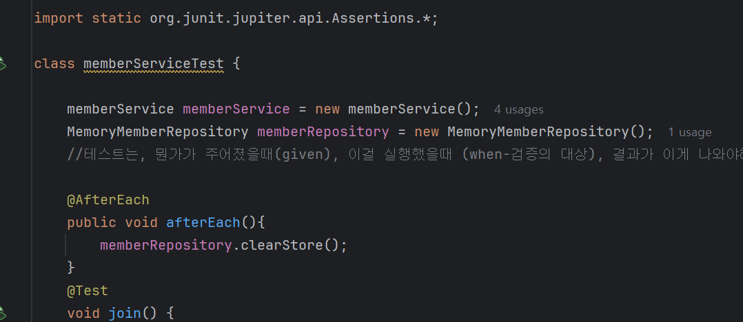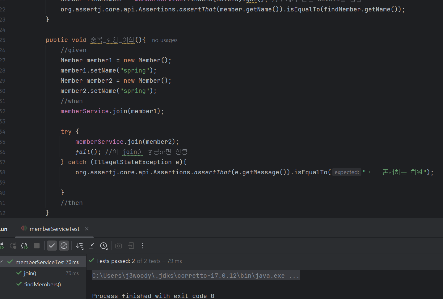 try-catch보다 더 간결한 문법 : assertThrows : join(member2)라는걸 실행했을때 IllegalStateException이라는 예외가 실행되어야한다는 의미