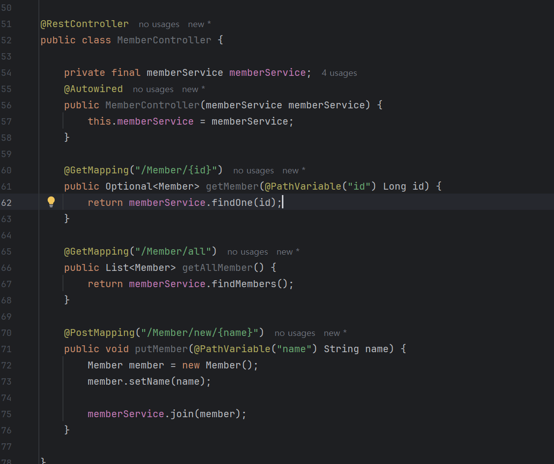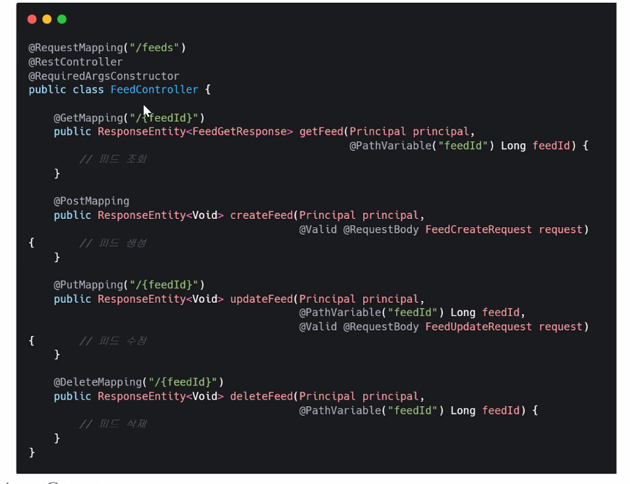 - @GetMapping , @PostMapping 등 : 역시 uri 매핑에 사용되지만, 위와의 차이는 주로 메소드레벨에서 쓰임(메소드가 명확히 특정되어 있어 코드 가독성이 높아짐)