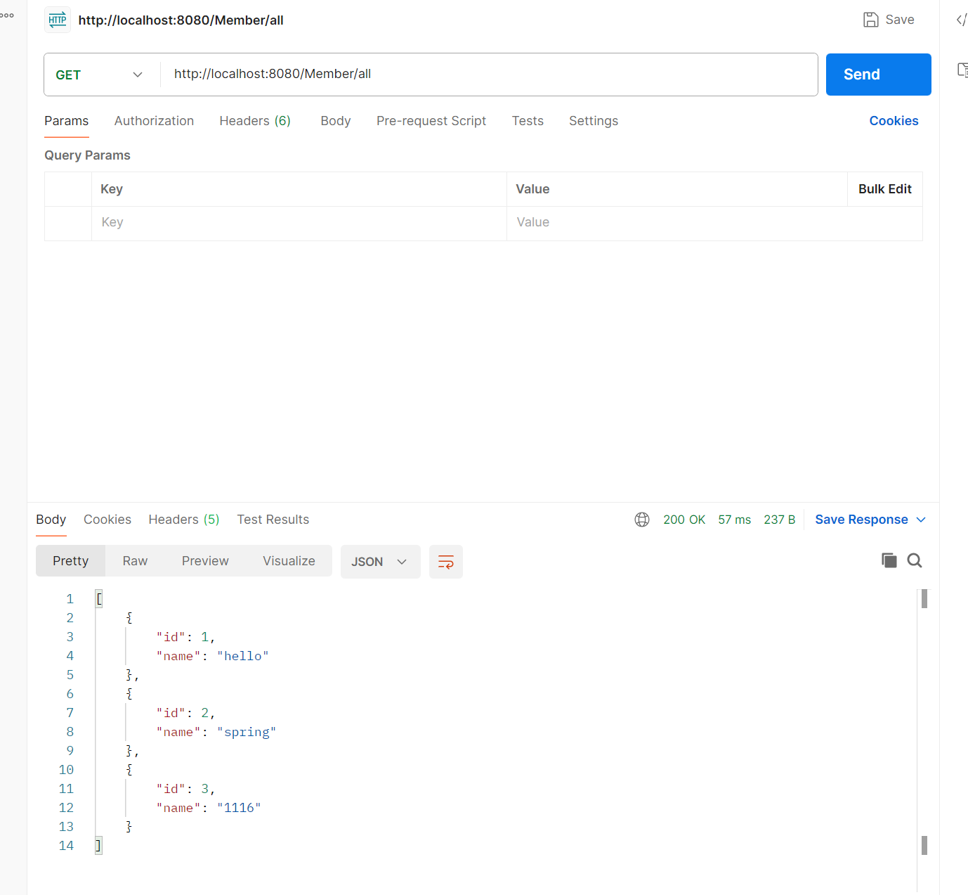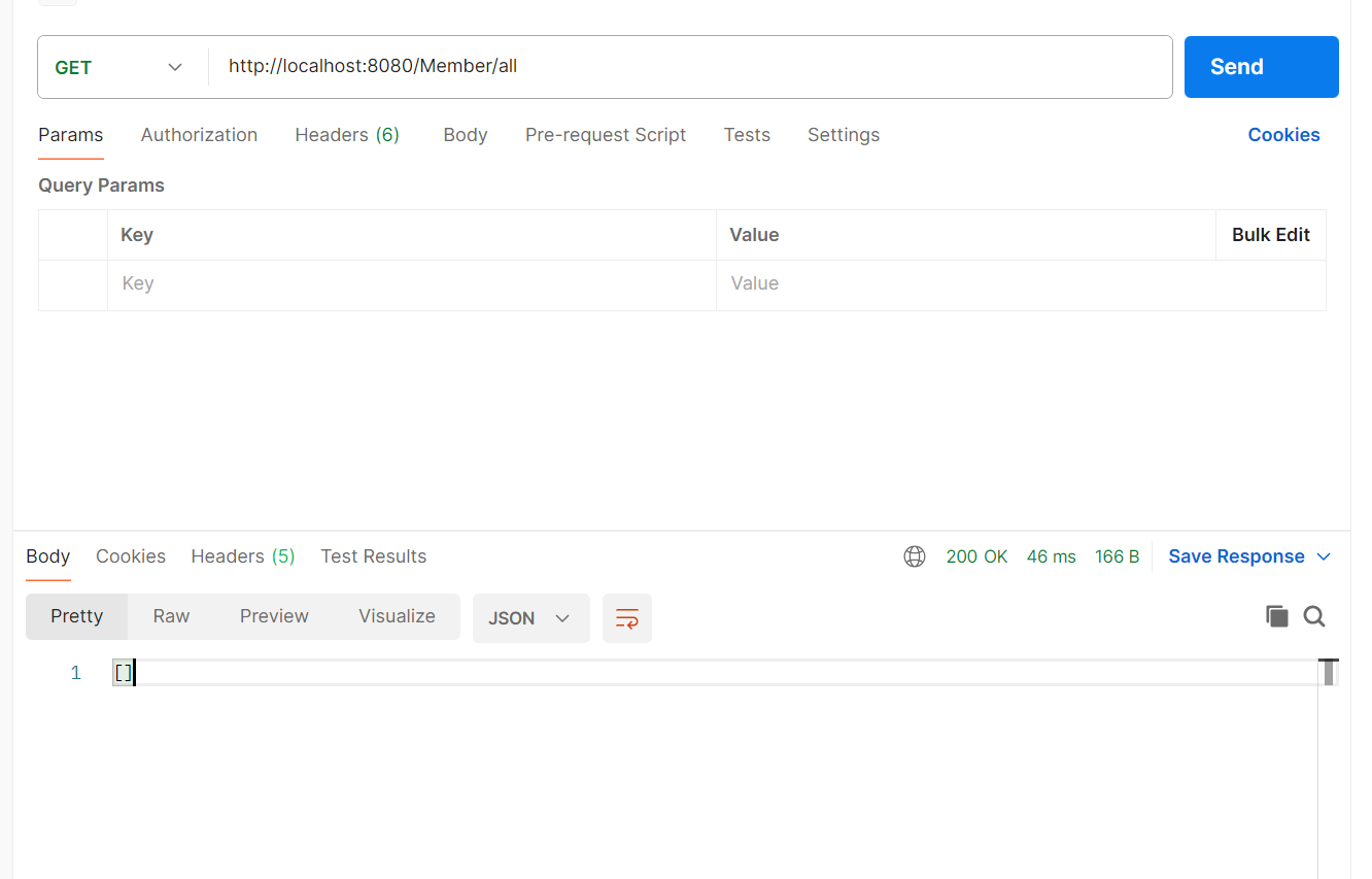 postman에서 테스트해보면 이렇게 아직 아무 회원 데이터도 없는 것을 확인 가능