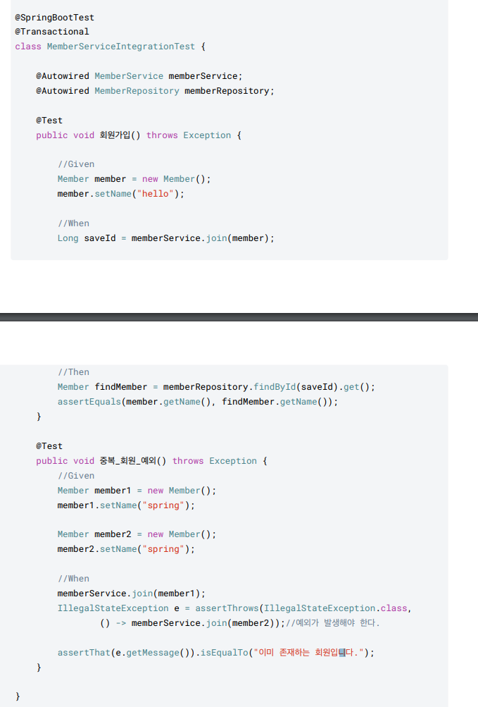 - @Transactional : 테스트 후 자동으로 테스트객체 지워줌(롤백) - 다음 테스트 또 가능 (이 어노테이션이 테스트 코드에 붙었을 경우)