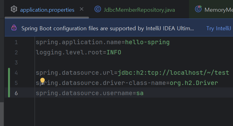 먼저 application.properties에 위에서 생성한 h2 db를 연결해준다