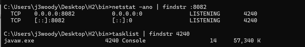 netstat 명령어를 확인해보니 8082 포트가 사용중인 프로그램의 PID가 4240임을 확인 가능했고, 4240 PID를 어떤 프로그램이 쓰는질 확인해보니 자바 프로그램이었다. 즉 JAVA 프로세스가 이미 H2 Web console이나 다른 자바 애플리케이션으로 실행되고 있다는 뜻이라고 한다 (즉 아까 내가 열심히 누른 h2 console이 내가 보는 창에서 새로 열리진 않았지만, 사실 이미 실행이 되어있었던것 같다)