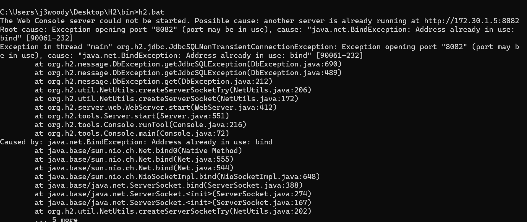 대강 읽어보니, 8082 포트가 이미 열려서(bind되어) 이 포트로 새로운 h2를 실행할 수 없다는 내용이었다