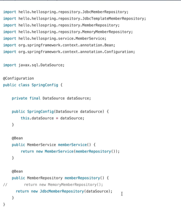 서비스코드를 하나도 손대지 않고, 어플리케이션의 설정 에 해당하는 config 파일 코드만 바꿔줌으로써 데이터 저장소를 편하게 바꿔낄 수 있다