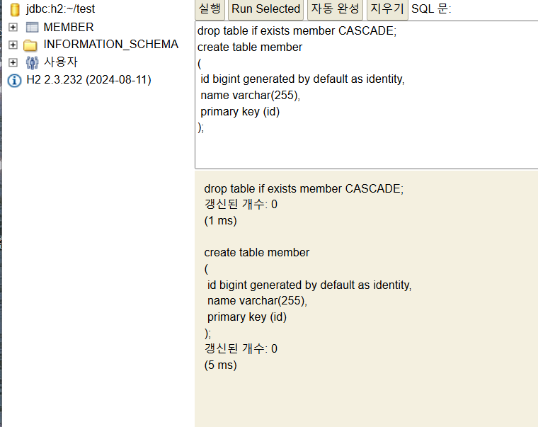 아무튼 이렇게 하고 다시 스프링부트를 실행하면 위처럼 이제 데이터가 날라가지 않고 뜬다 (h2 데이터베이스의 상태가 뜬다)