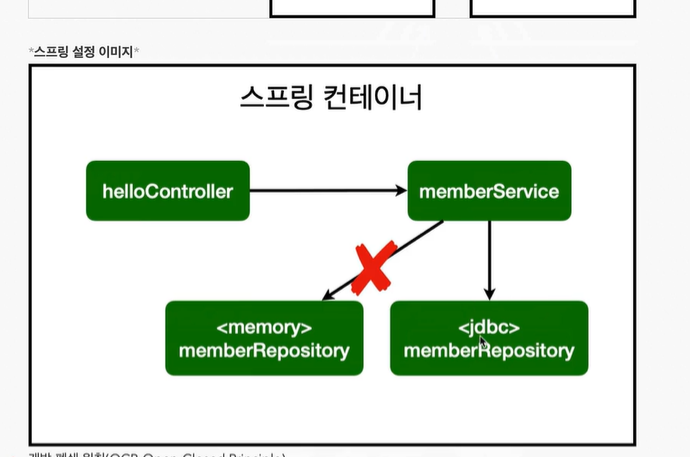 - 개방-폐쇄 원칙 : OCP - 확장에는 열려있고, 수정에는 닫혀있다 (JDBC 기반의 리포지토리는 새로 만들었지만, 기존 서비스코드나 다른 코드를 전혀 수정하지 않아도 됐음)