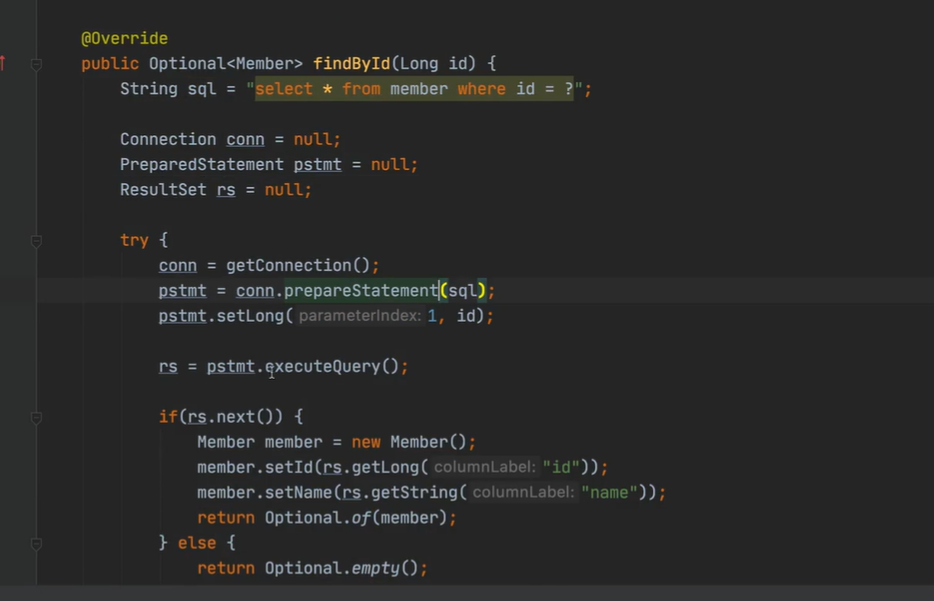 그 후 reposiroty 폴더에 JdbcMemberRepository 파일을 만들어준다 (MemberRepository를 메모리로 구현하던 MemoryMemberRepository와 달리, db에 연결해서 구현하는 파일)