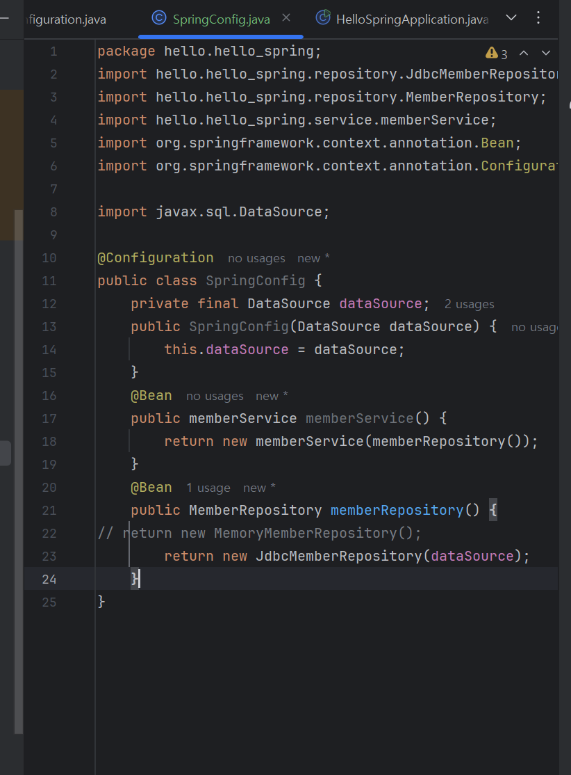 3) SpringConfig: 핵심 비즈니스 로직 및 Repository 구성 - 애플리케이션의 주요 비즈니스 로직(memberService)과 데이터 접근 계층(JdbcMemberRepository)의 구성 요소를 명시적으로 정의, Spring Boot에서 자동으로 설정된 DataSource를 주입받아(@Autowired) 데이터베이스와 연결되는 Repository를 구성 = 핵심 기능